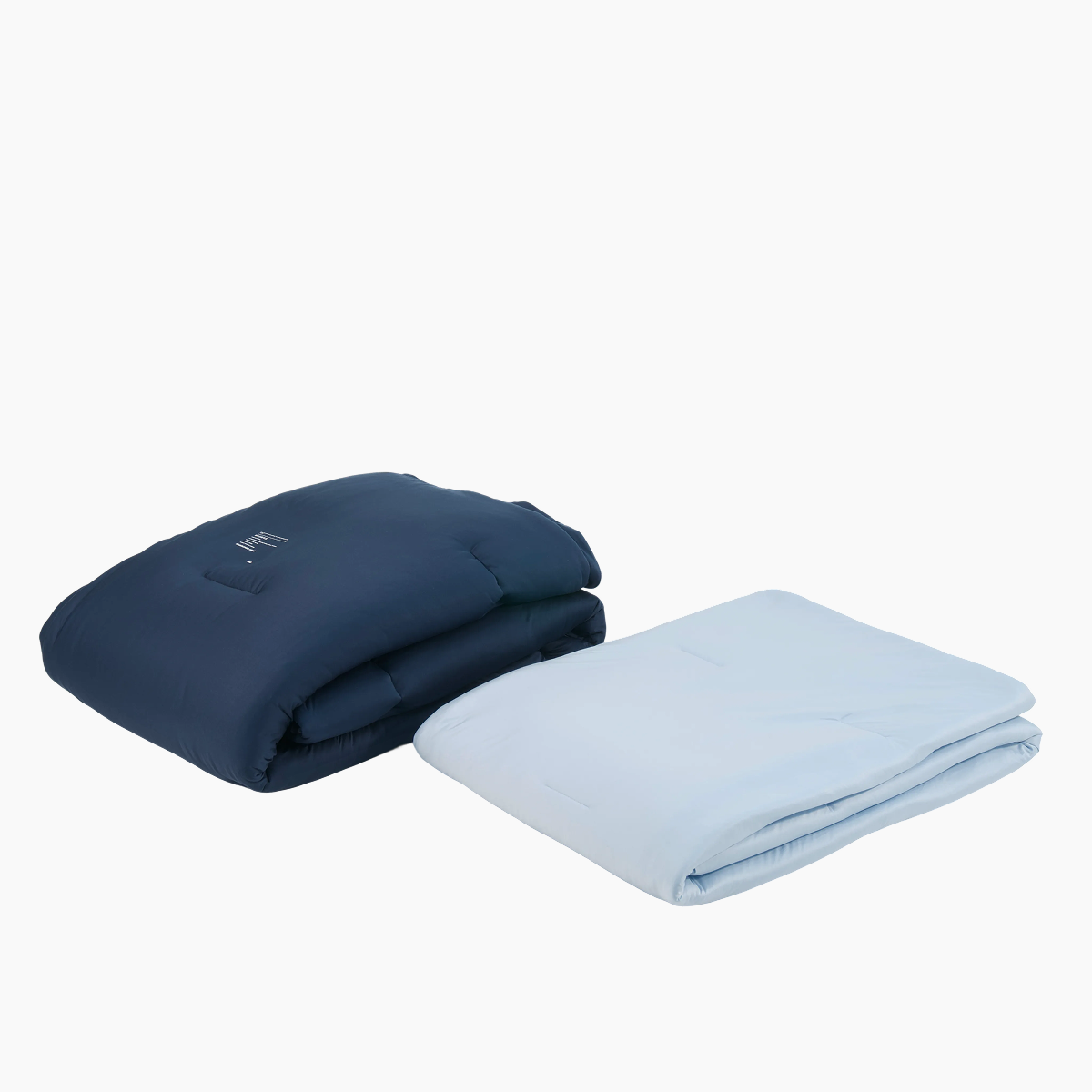 季節や体温に合わせて、ファスナーで2枚のレイヤーを簡単に着脱できる構造。寒い時期は重ねて保温性を高め、暑い時期は軽いレイヤーだけで快適に。1枚のコンフォーターで、春夏秋冬すべての季節に対応します。