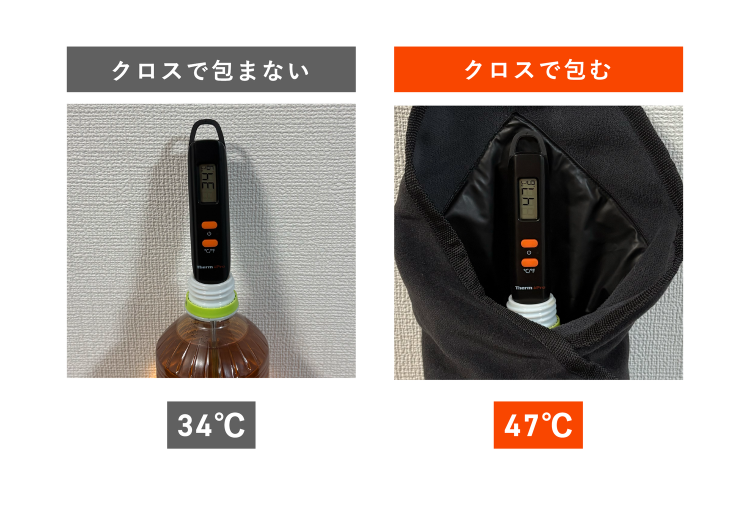 温かいお茶をクロスで包み、通電せずに温度変化を比較。90分後、クロス未使用の場合は34℃まで低下したのに対し、包んだ場合は47℃を維持しました。発熱させなくても、独自の多層構造により熱を逃しにくい設計です。