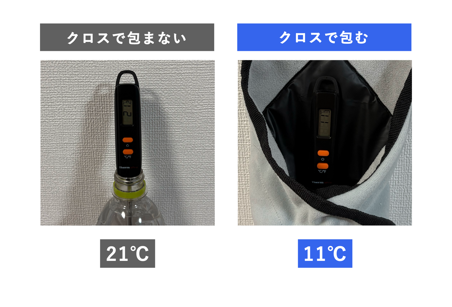 冷たい水をクロスで包み、温度変化を比較。90分後、クロス未使用の場合は21℃まで上昇したのに対し、包んだ場合は11℃を維持しました。本製品に冷却機能はありません。
