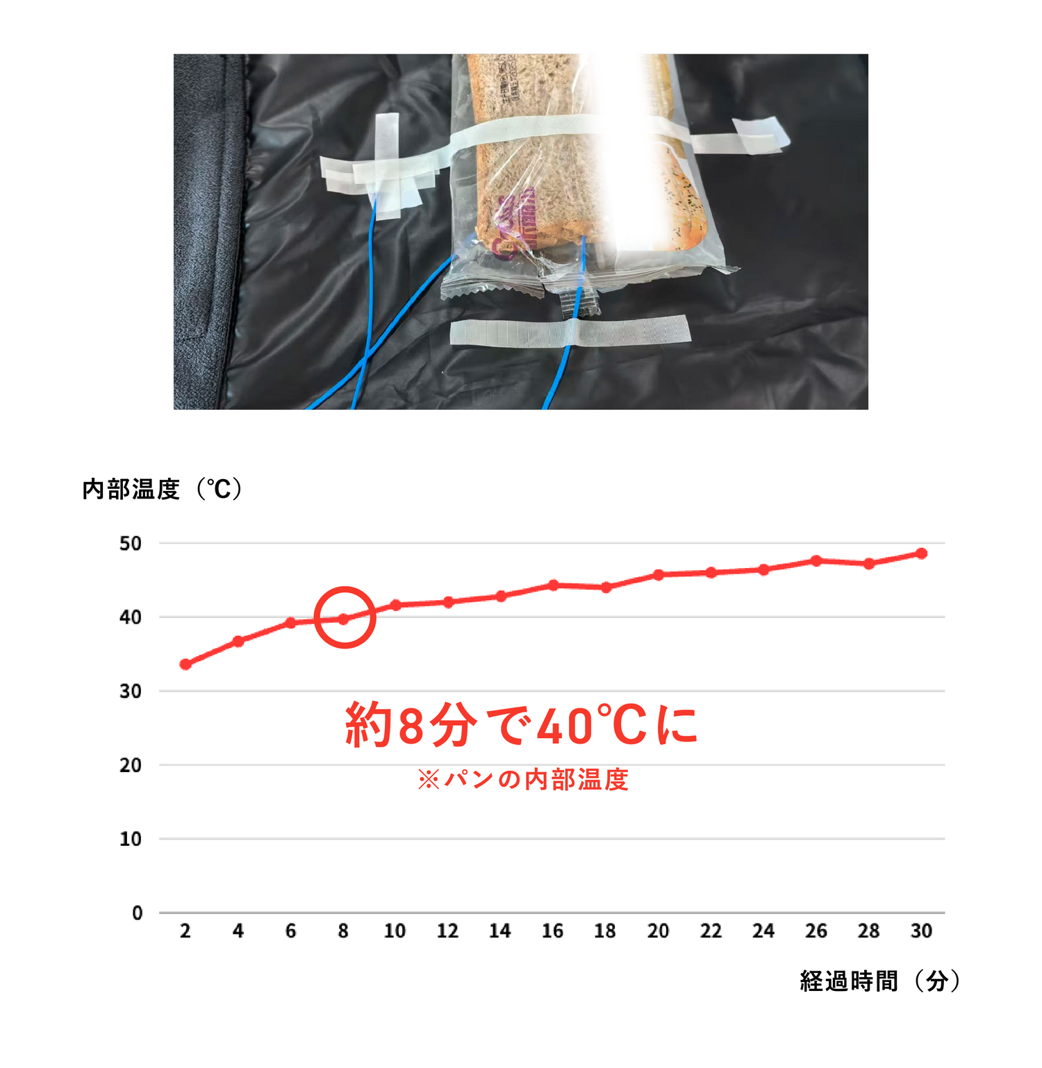 常温のパンを包み、加熱モードで使用した場合、内部温度は約8分で約40℃に到達。クロスが面で発熱するため、潰さず、やわらかい食感のまま温めることができます。