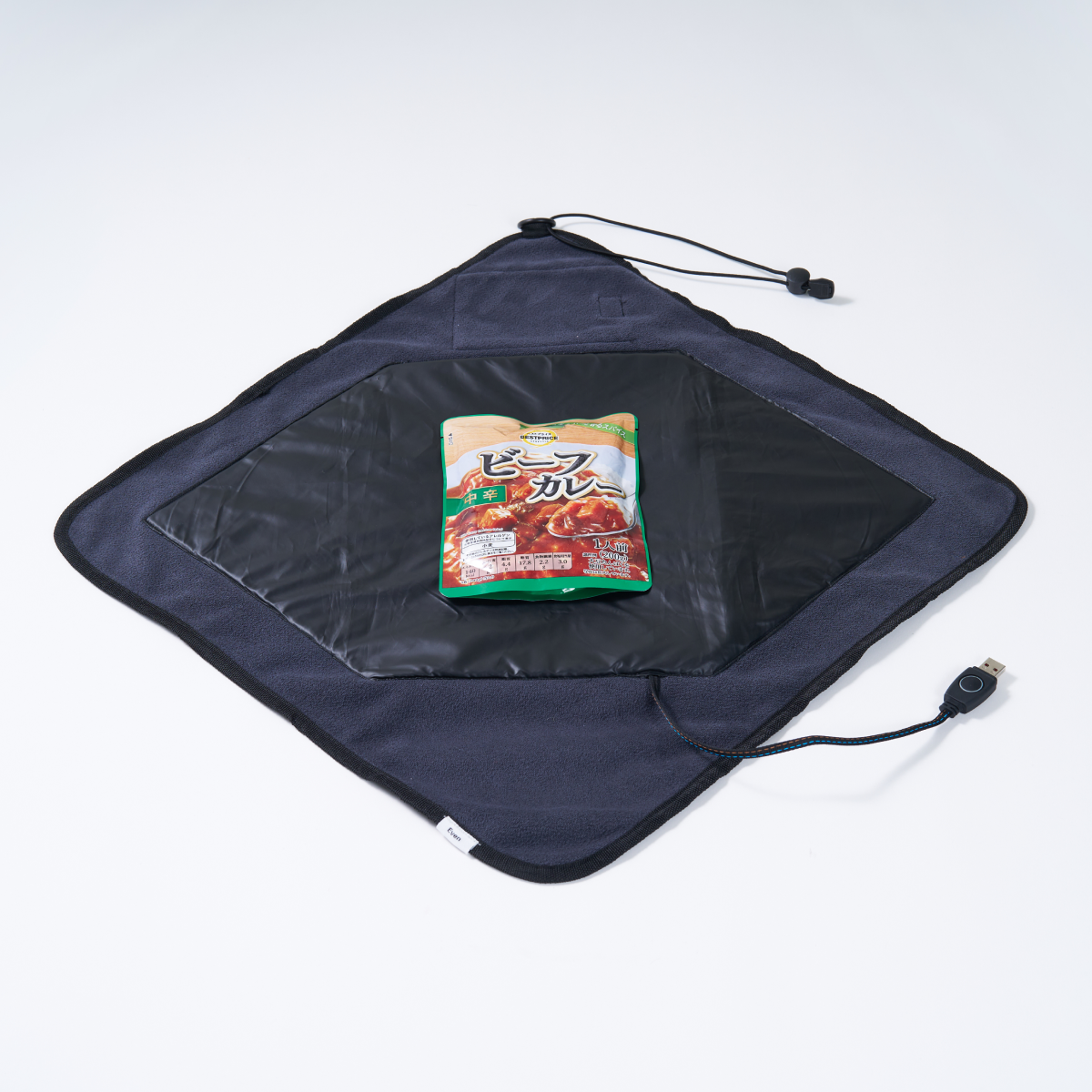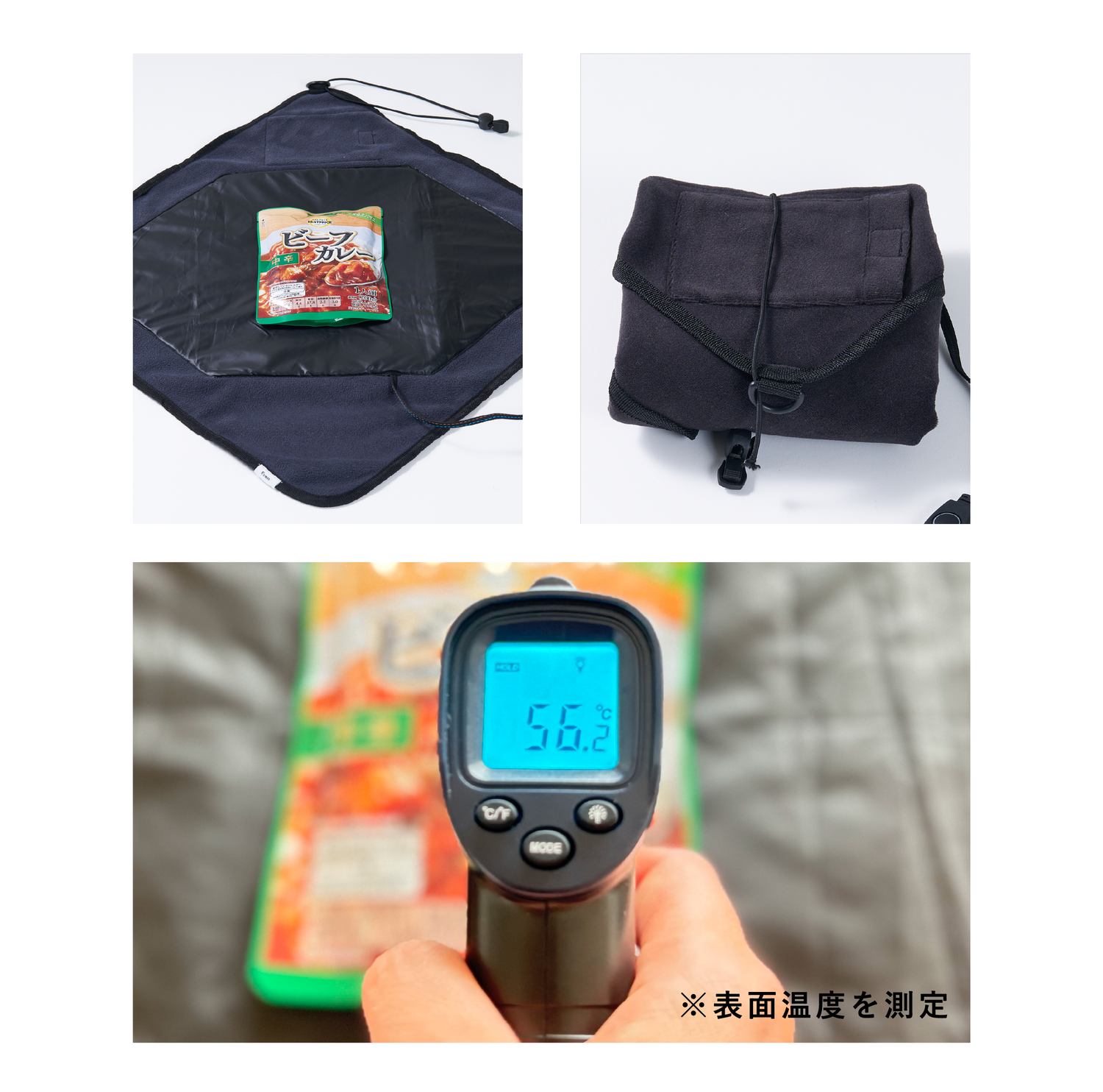 実測では、100gのレトルトカレーが約20分で56℃に到達。電子レンジが使えないオフィスや車内、屋外でも、包むだけで温めることが可能です。